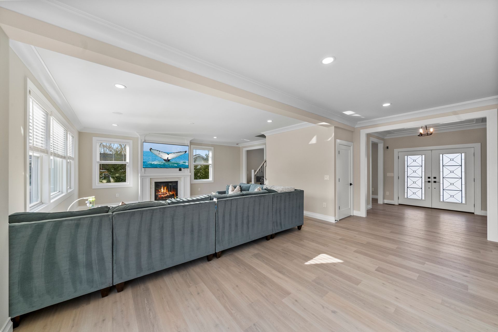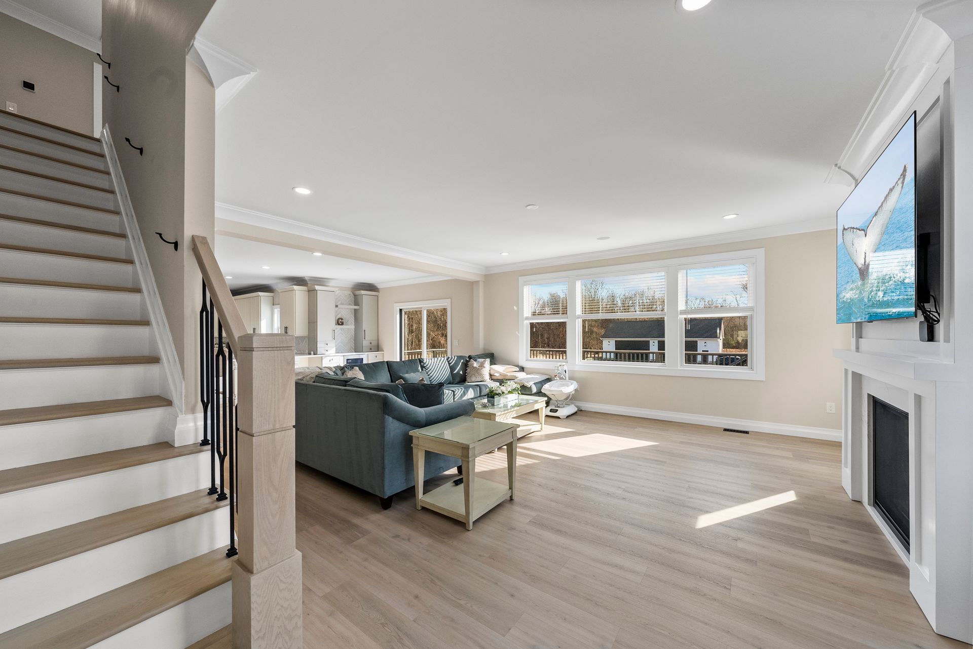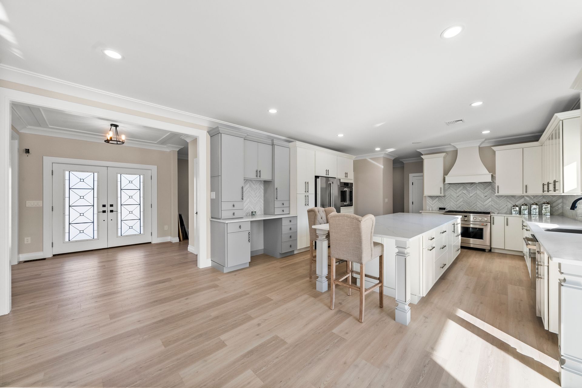 Step inside to find an elegant open-concept main level featuring a gourmet kitchen with GE Café appliances, an oversized island, and a butler's pantry that flows seamlessly into the inviting family room with a gas fireplace. Just off the kitchen, a walk-in pantry provides additional storage, and a full bathroom on this level adds convenience.