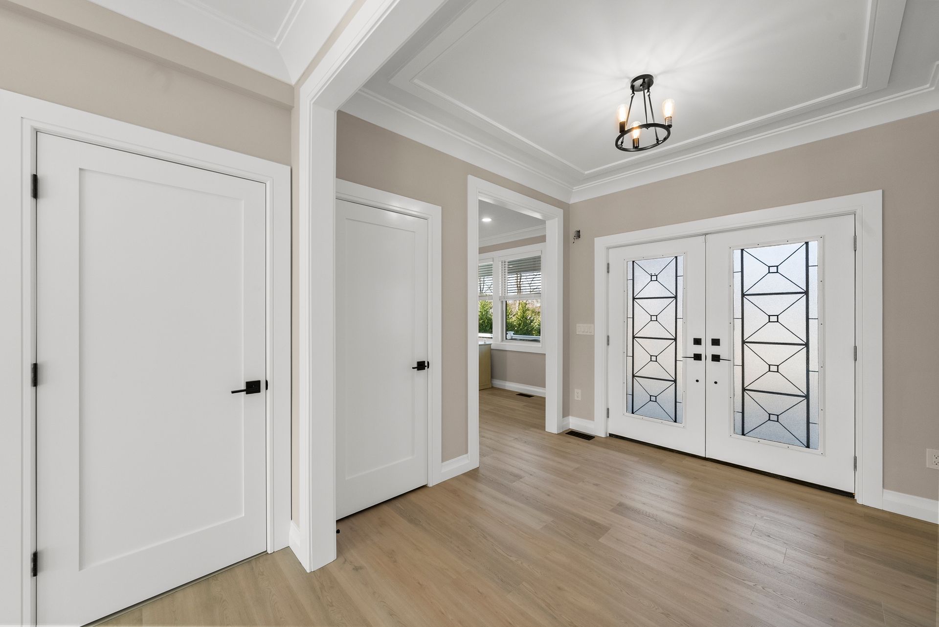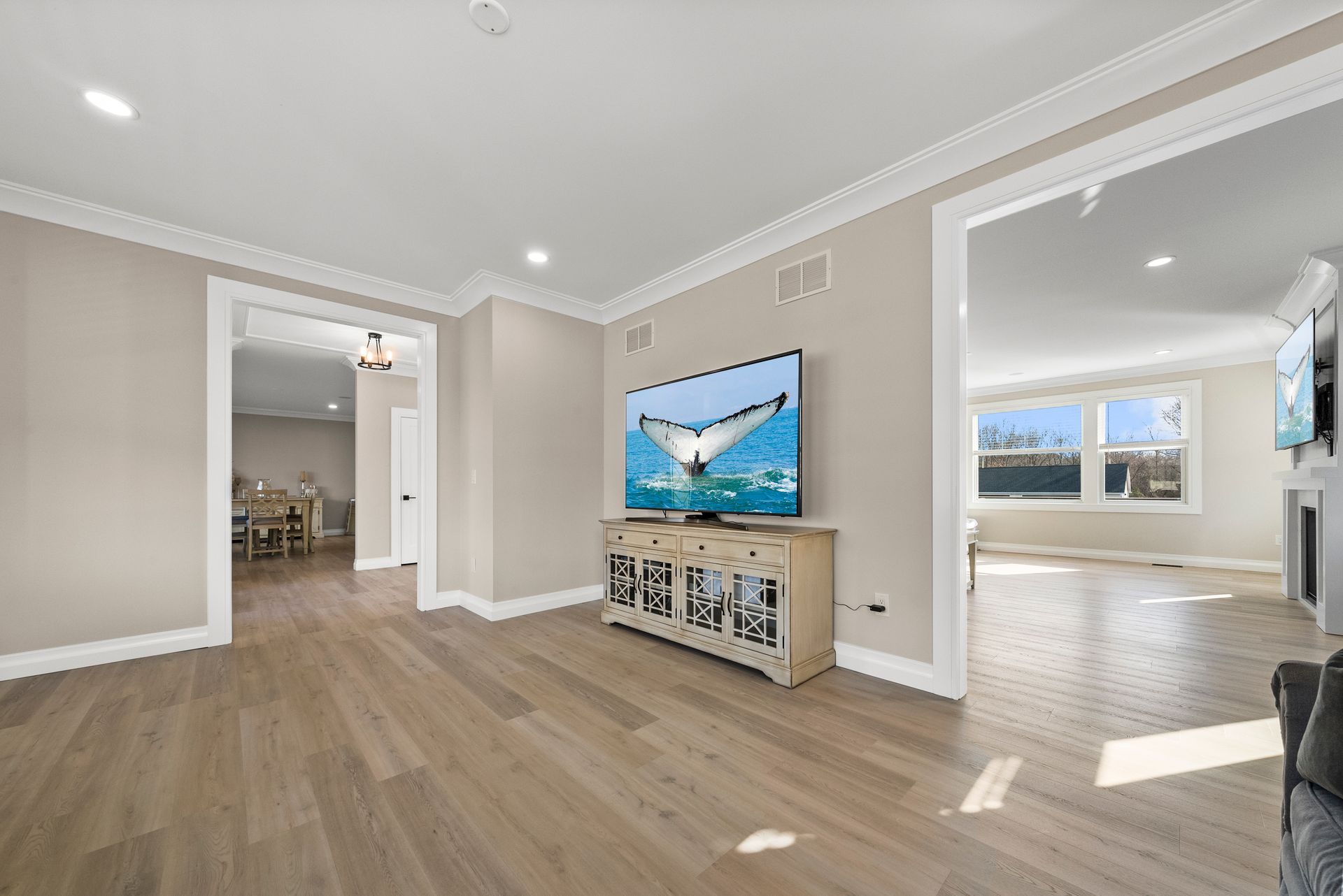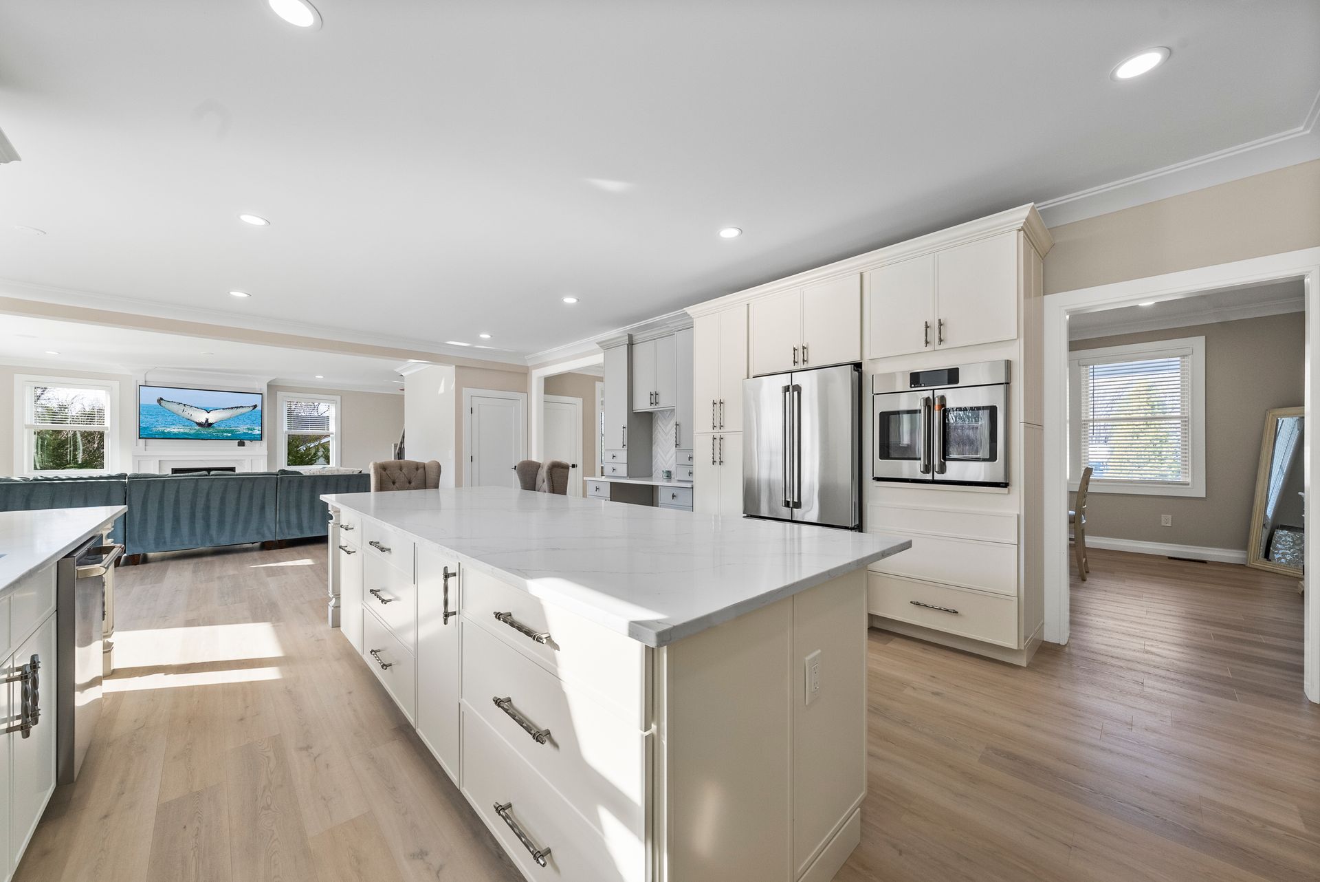 Step inside to find an elegant open-concept main level featuring a gourmet kitchen with GE Café appliances, an oversized island, and a butler's pantry that flows seamlessly into the inviting family room with a gas fireplace. Just off the kitchen, a walk-in pantry provides additional storage, and a full bathroom on this level adds convenience.
