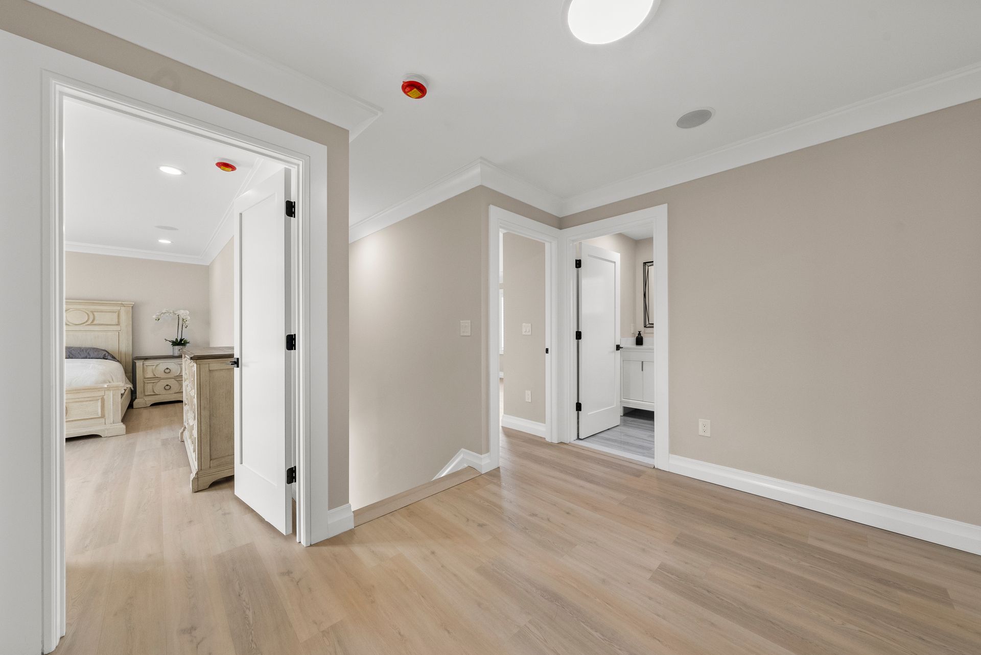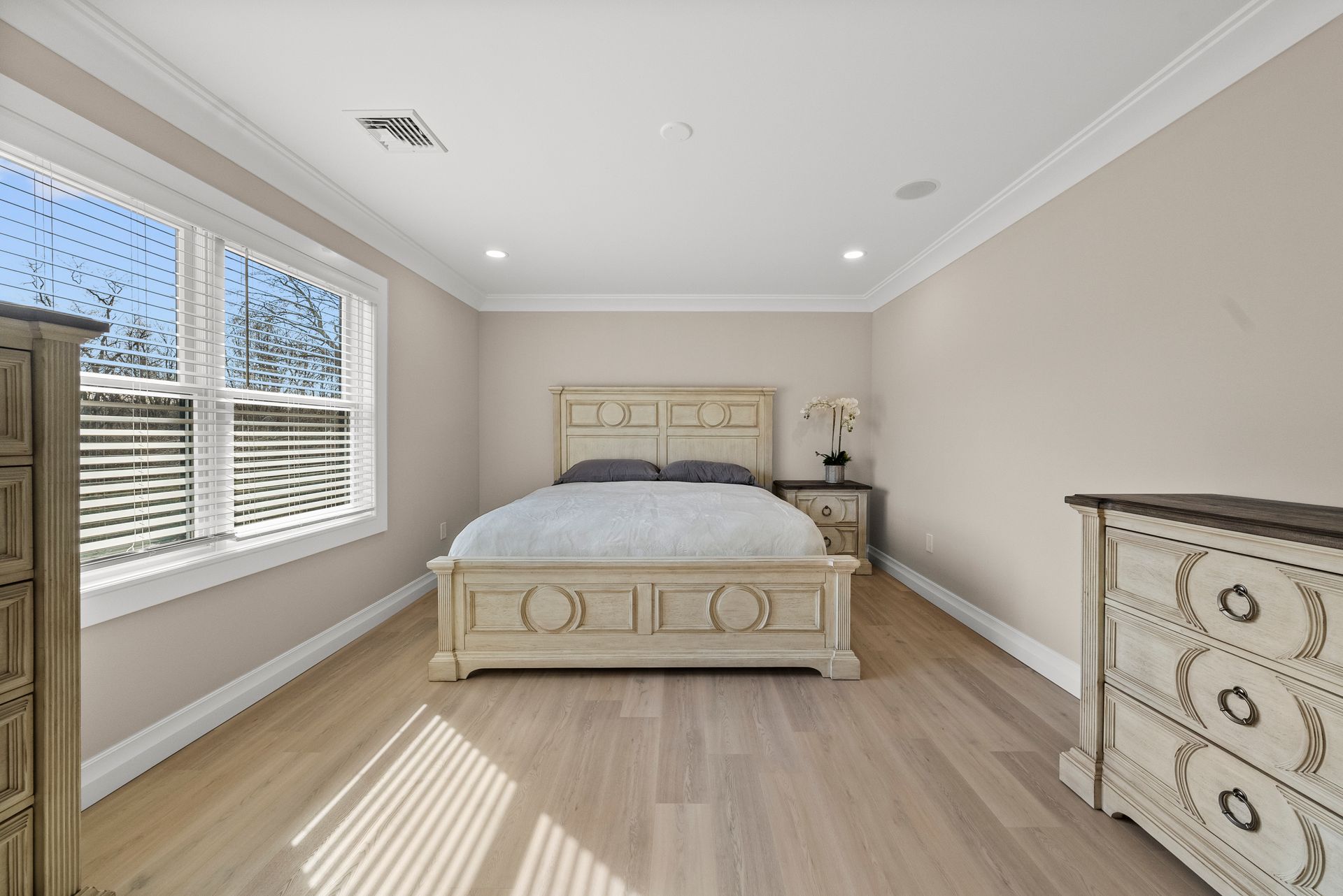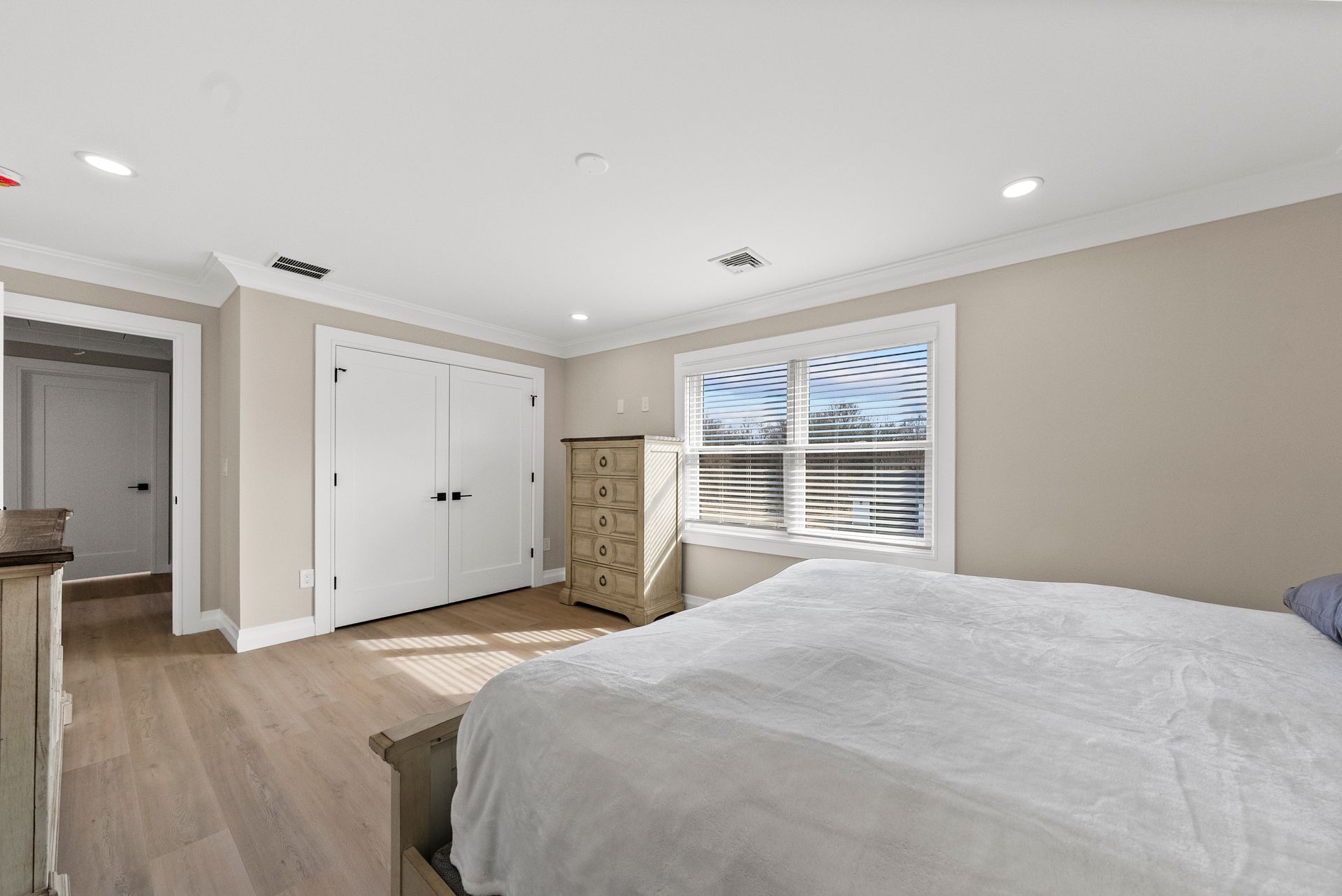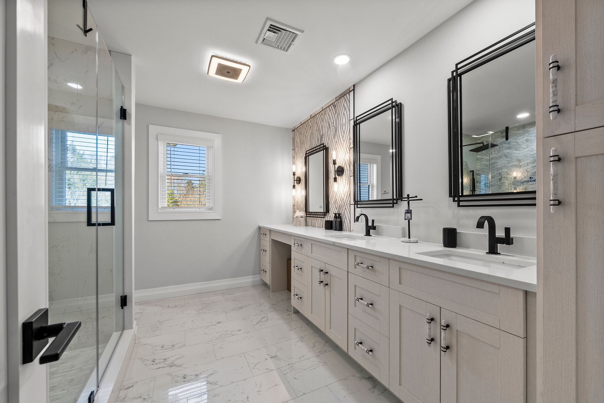 Upstairs, you'll discover four generously sized bedrooms, all equipped with recessed lighting and ample closet space. The primary suite is a true retreat, offering two large walk-in closets, two linen closets, and a spa-like en-suite bath with a walk-in shower with bench, dual vanity, and a dedicated makeup counter. The laundry room is also located on this level, featuring plenty of cabinet space for organization.
