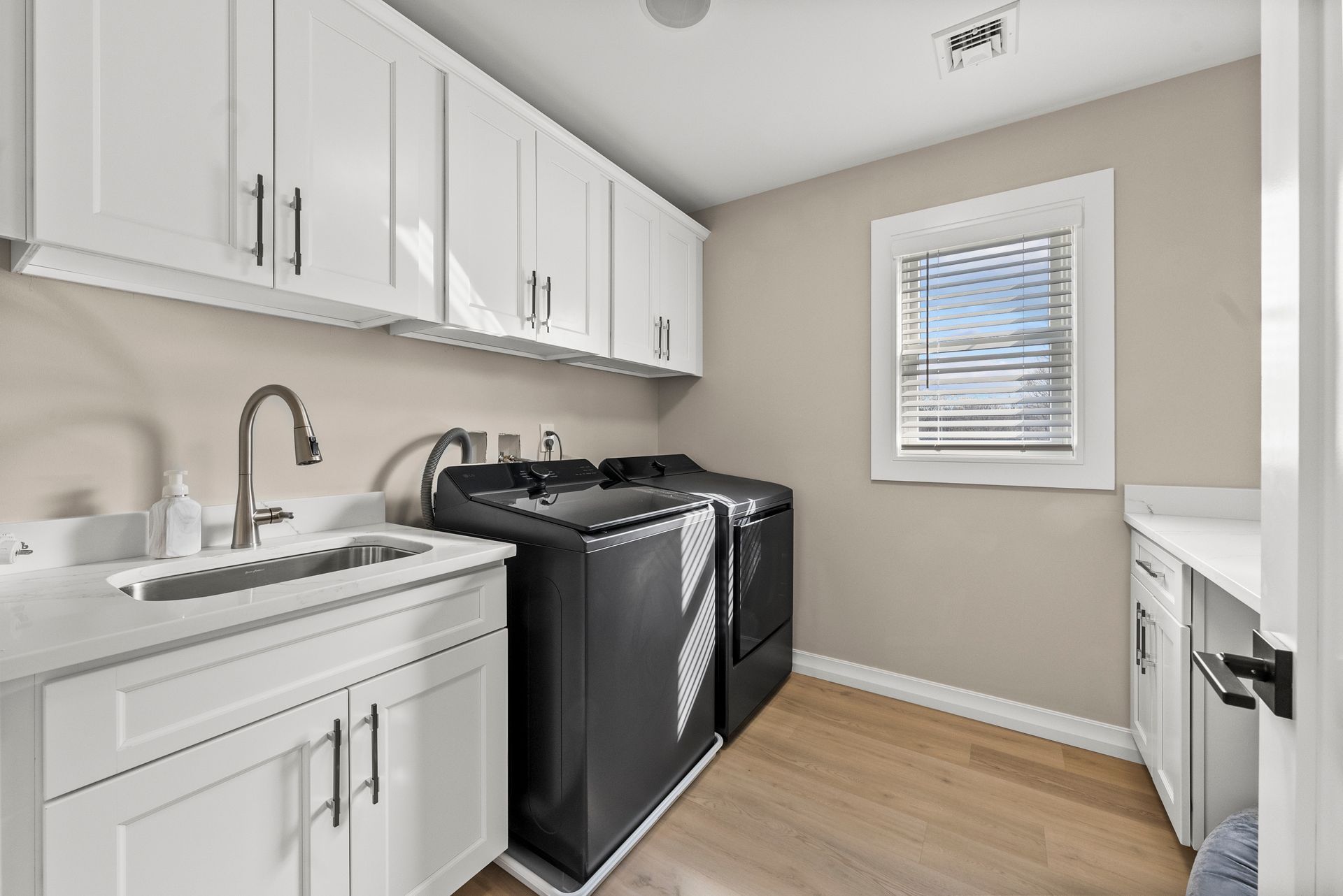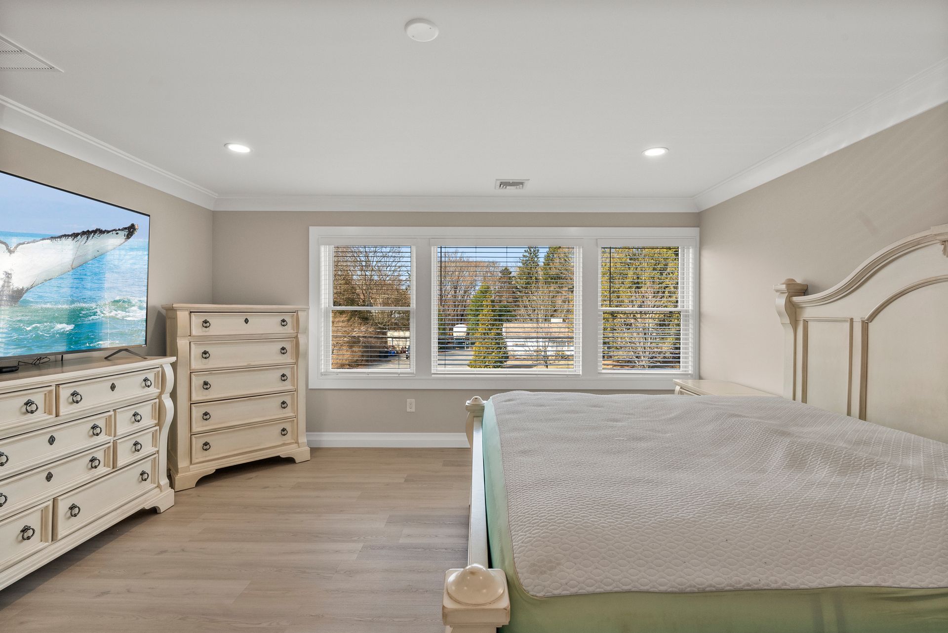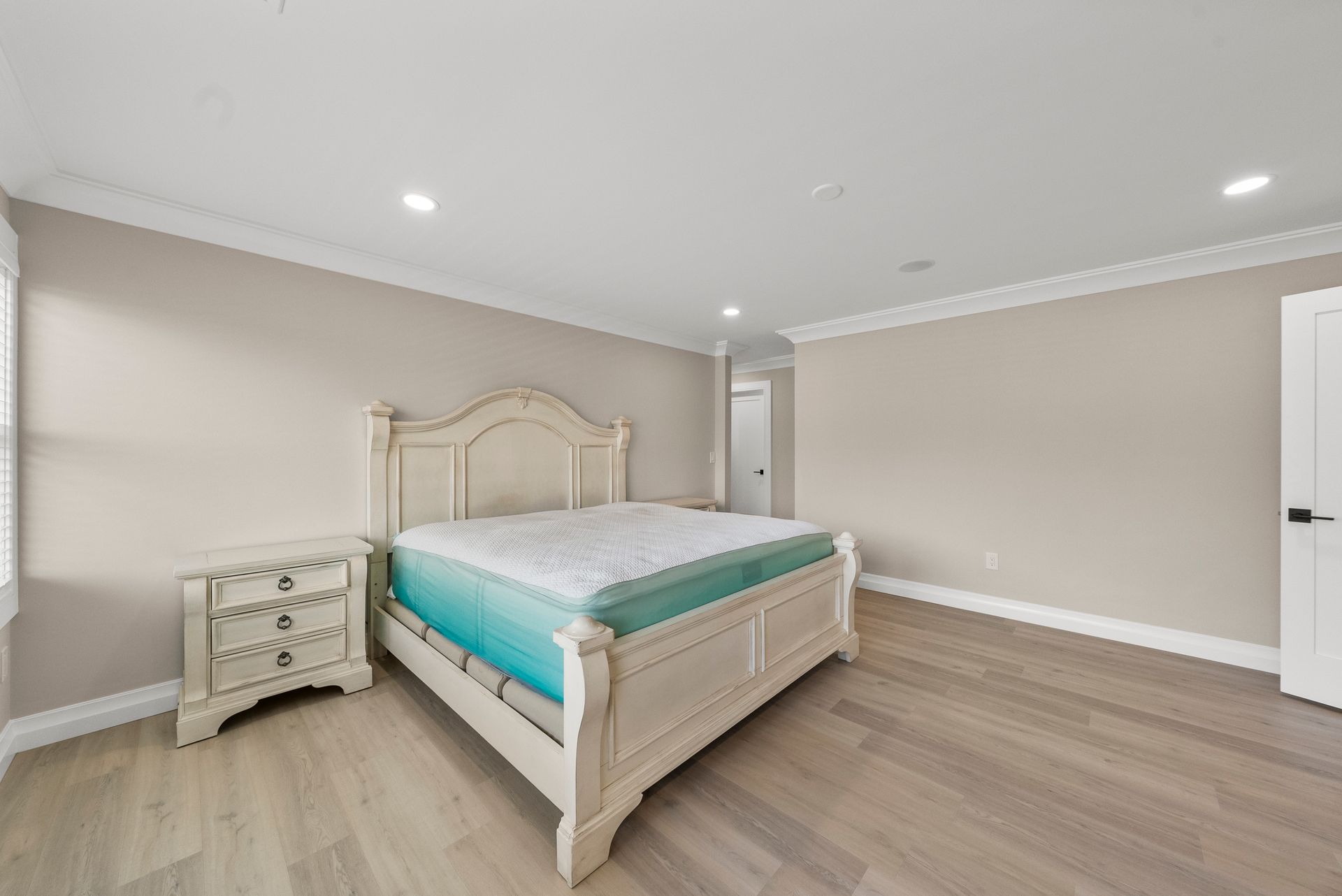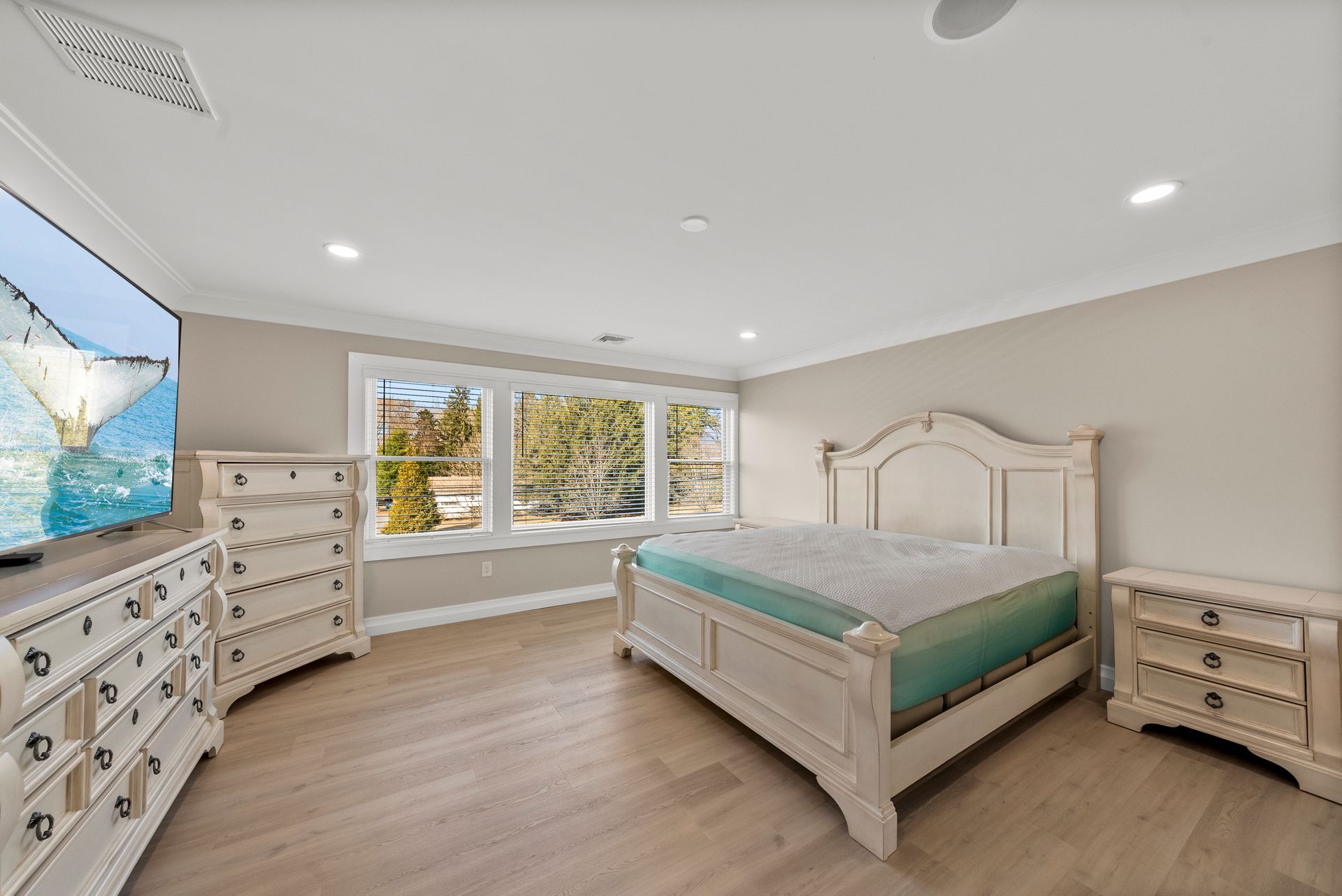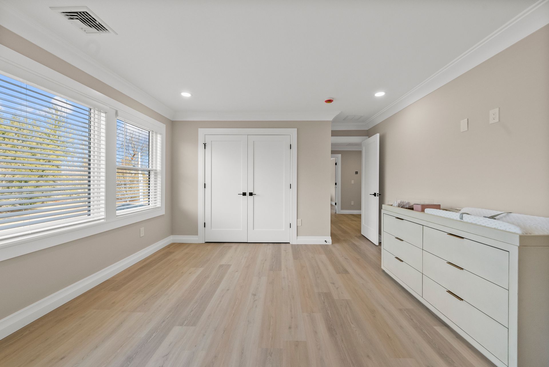 Upstairs, you'll discover four generously sized bedrooms, all equipped with recessed lighting and ample closet space. The primary suite is a true retreat, offering two large walk-in closets, two linen closets, and a spa-like en-suite bath with a walk-in shower with bench, dual vanity, and a dedicated makeup counter. The laundry room is also located on this level, featuring plenty of cabinet space for organization.